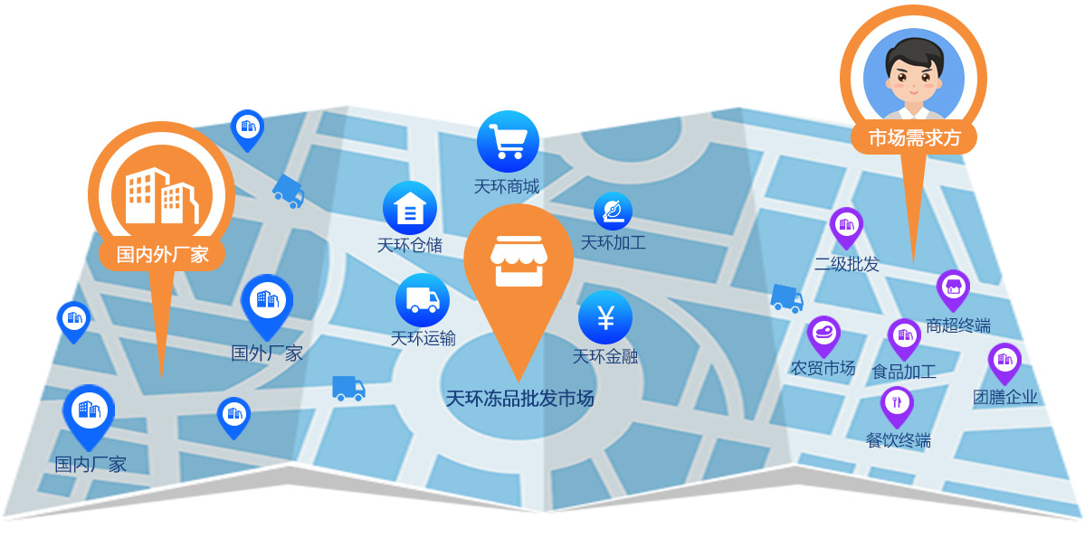 天環(huán)商城是依托于線下實(shí)體批發(fā)市場(chǎng)而搭建的一個(gè)專注在冷凍食品供應(yīng)鏈的B2B電商平臺(tái)。
